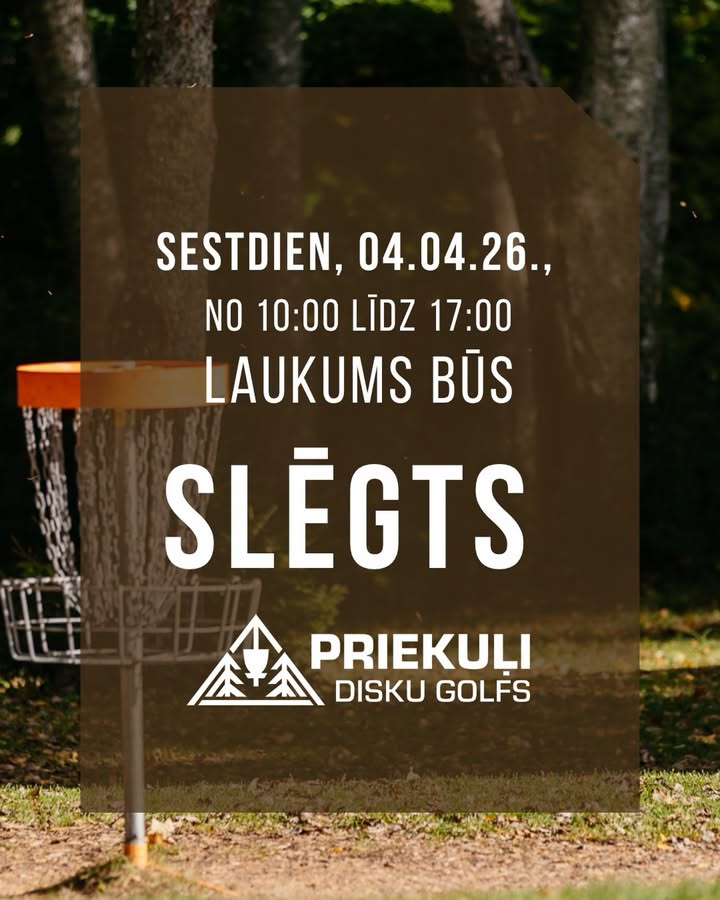 VTDT disku golfa laukums Priekuļos 3. Aprīlis, 2026 ‼️Informējam, ka rītdien, 4.aprīlī, @priekuli_disku_golfs norisināsies pasākums un laukums nebūs pieejams no 10:00-17:00. Tiekamies laukumā pirms un pēc pasākuma🙌 https://www.facebook.com/104522504930391_1536209088515476
