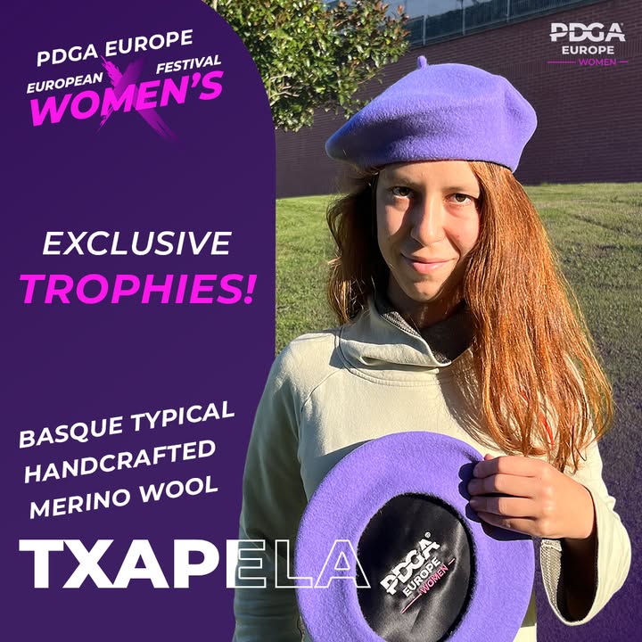 A unique event calls for a unique trophy! The winners of the six women's divisions at this weekend's PDGA Europe Women's Festival in Bilbao (Spain) will receive the traditional Basque "Txapela" beret: handmade from Merino wool in a beautiful purple color and embroidered with the "PDGA Europe Women" logo on the inside lining so you can also wear it in your everyday life!